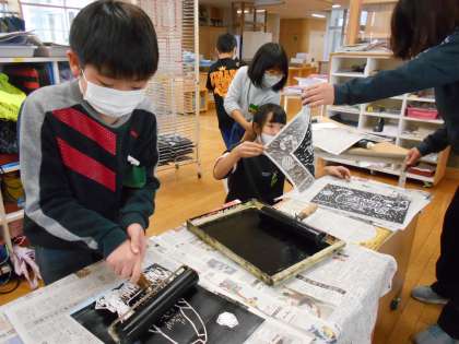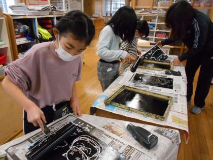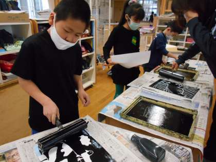 3年生は、彫刻刀で彫り終わった人から、ローラーでインクを塗り、本番の紙に刷りました。
