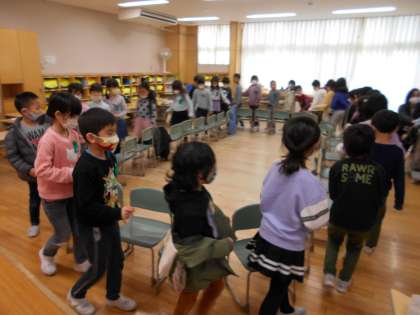 2組はみんなが好きなアニメの曲に合わせて椅子取りゲームをしました。曲に合わせてノリノリで椅子を周りました。