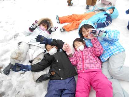 雪だるまやすべり台を作ったり、雪玉を作って遠くまで投げたりして楽しみました。駐車場の大きな雪山にも登り、思い切り体を動かしました。