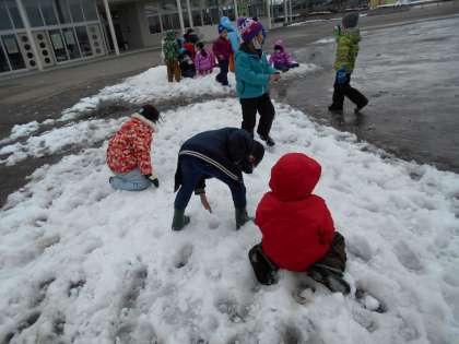 昨日降った雪が少しだけ残っていたので、グラウンドに出て雪遊びをしました。
