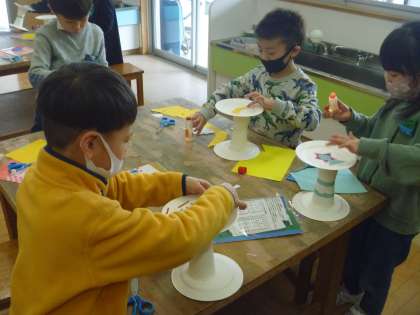 テープで紙皿と紙コップをくっつけて、色紙で飾りをつけています。ころころ転がるだけで、子供たちは楽しそうでした。