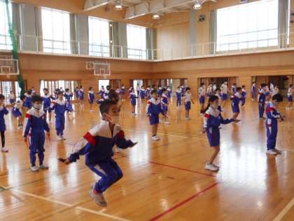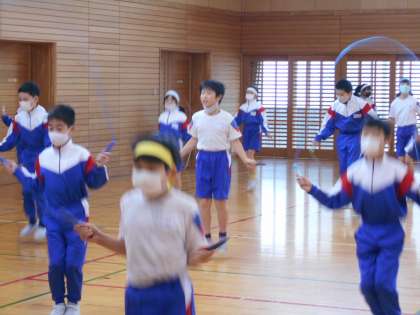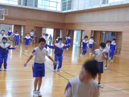 朝活動には、体力つくりとして、運動委員会考案の「リズム縄跳び」に挑戦しました。リズムに合わせながら楽しく体力向上を目指す姿が見られました。