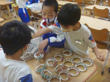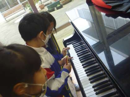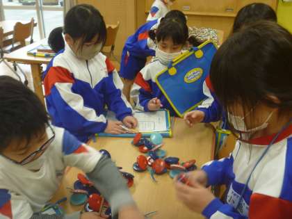 算数の学習では、「大きい数」の学習を生かして「かずさがしビンゴ」をしました。身の回りにあるものの数を数えて、ビンゴカードに記入します。教室の机やロッカーの数を数えたり、音楽室にある楽器の数を数えたりしました。10のまとまりを作って、正しく数えました。