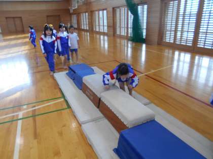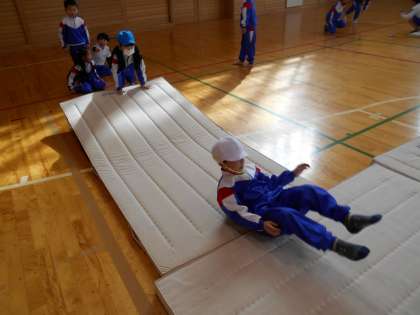 壁歩きコーナー、川跳びコーナー、ころころ回転コーナーの3つのコーナーに分かれてマット遊びを行いました。跳び箱に手をついて足を高く上げて跳んだり、肋木に足を掛けて壁を上ったりしました。