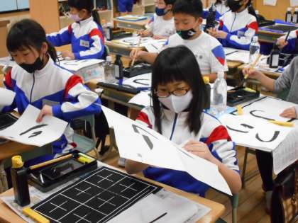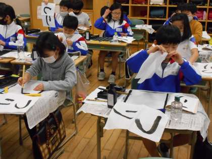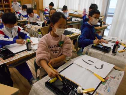 毛筆で、ひらがな「つり」を書くことに挑戦しています。