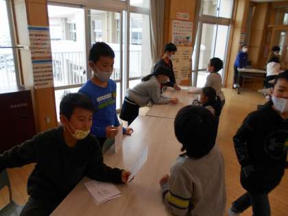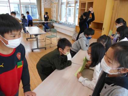 外国語で作った3ヒントクイズを、グループに分かれて解き合っています。