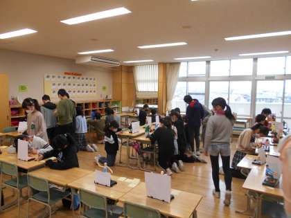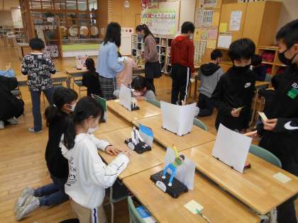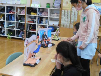 図画工作科では、針金と紙粘土を用いて、将来の自分の様子について作品を完成させました。今日は、クラスで鑑賞会を行いました。付箋に作品のよさを書いて、作者の机に貼っている様子です。