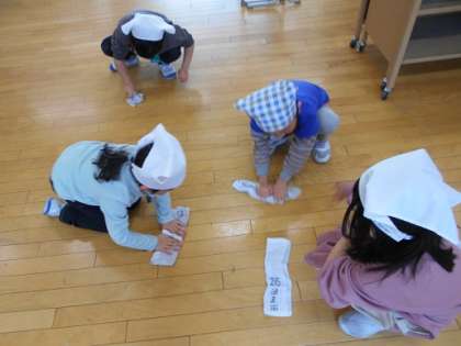 今日から環境美化強化月間です。汚れている場所を進んで見付けて、水拭きをしました。一生懸命掃除して、ぴかぴかになった床を見て、「きれいになってよかった」と嬉しそうにしていました。