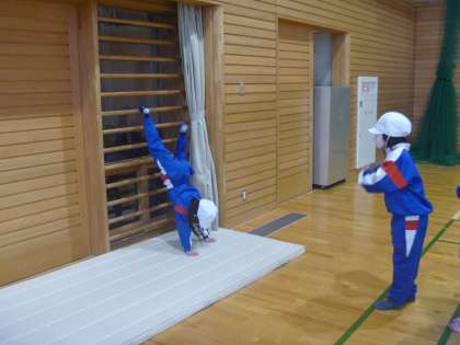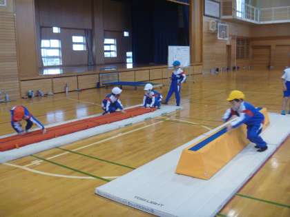 川跳びコーナー、ころころ回転コーナー、壁登りコーナーに分かれて、マット遊びを行いました。上手になるこつや、友達の上手なところを見付けながら取り組みました。