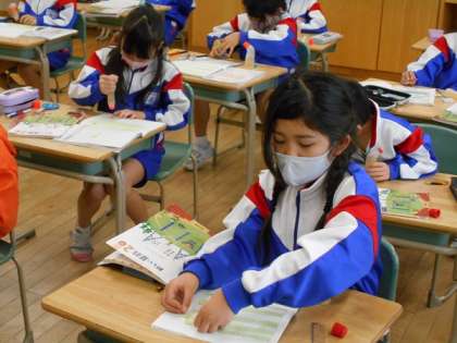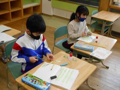 算数科で、分数の学習をしています。テープを折り曲げて、二分の一や四分の一等を作り、ノートに貼りました。