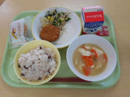 今日のメニューは 赤飯 メンチカツ 紅白白玉汁 シフォンケーキ 牛乳です。