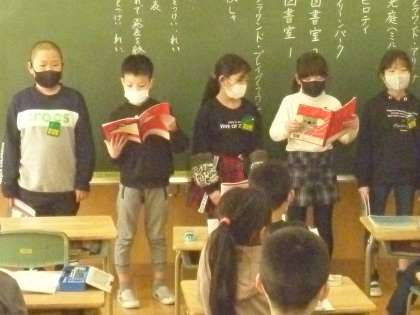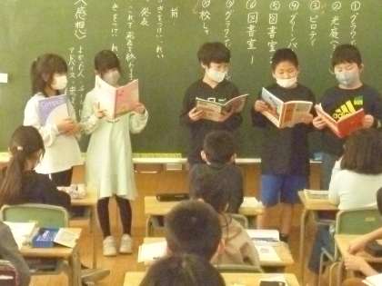 国語科「わたしたちの学校じまん」の学習では、図書室やピロティなど豊田小学校の自慢だと思うところを見付け、その理由をグループで分担して紹介しました。