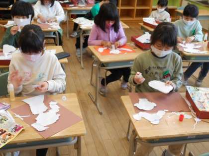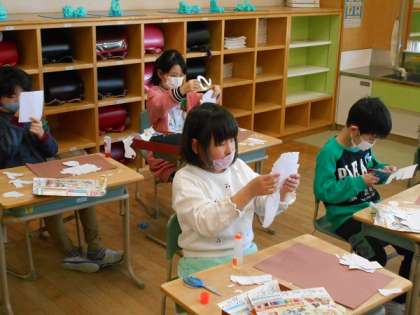 画用紙を使って、紙版画の版を作っています。ちぎったり、はさみで切ったりした紙を、面白い動きになるように組み合わせていきました。刷り上がりが楽しみです。