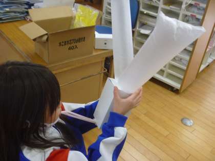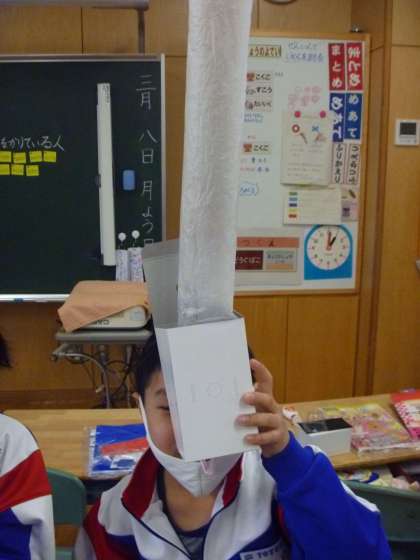 図工科の学習で、工作をしています。ストローで息を吹き込むと、箱からビニール袋がにょきにょき出てきます。子供たちは、袋が飛び出したり、伸びたりしていく様子から、どんな作品にしようか考えながら作っています。おもしろい作品がたくさんできそうです。