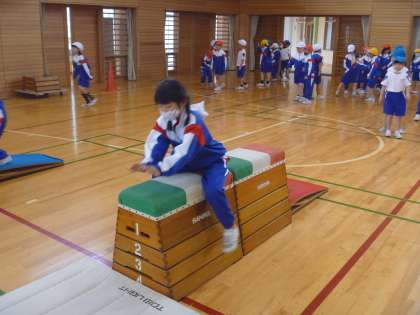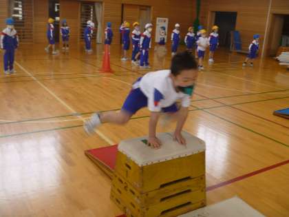 体育の学習で「とびばこあそび」をしています。いろんな跳び方で跳び箱に慣れて、楽しく活動しています。子供たちは、準備や後片付けにも意欲的に取り組んでいます。