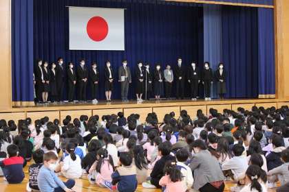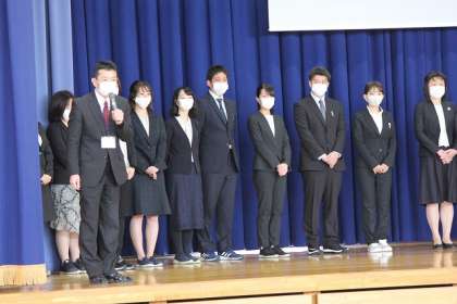 今年度、新しく豊田小学校に来られた先生の紹介がありました。たくさんの先生が新しく豊田小学校に来られました。代表して校長先生から自己紹介がありました。