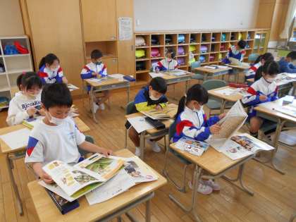 生活科の学習では、野菜の育て方を調べました。本を読み、わかったことをワークシートに一生懸命書きました。