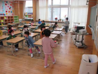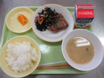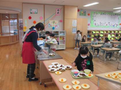 今日から1年生も給食が始まりました。自分たちで静かに並び、お盆に入れ、机まで運んでいました。給食の時間も一つ一つを学んでいる様子が見られました。