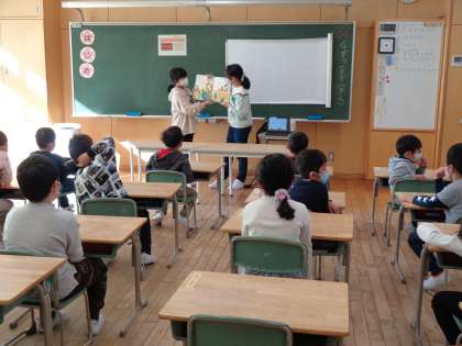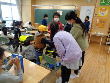 朝の準備や休み時間に、6年生が1年生のところに行ってお世話してくれています。