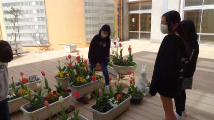 飼育栽培委員会の子供たちがウサギのミルクを庭で散歩させています。天気がよく気持ちが良さそうです。