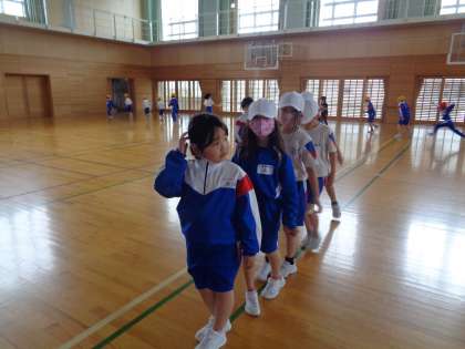 アリーナを使って体育の授業を行いました。ペアになっていろいろな動きをしたり、グループで先頭さんのまねっこをしたりと、大きなアリーナいっぱい使って楽しく運動しました。