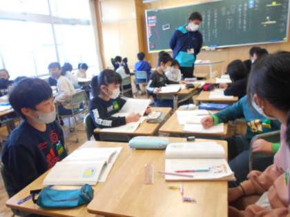 国語科では、あまんきみこさん作の「白いぼし」を読んでいます。不思議に思ったこと等を友達と出し合っています。
