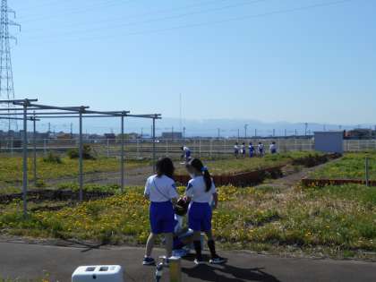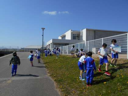 理科「春のしぜんにとびだそう」の学習では、春の生き物を観察するために、グラウンド周辺や畑に行きました。「チョウだ!」「この紫の植物は何だろう」と話しながら楽しそうに観察していました。