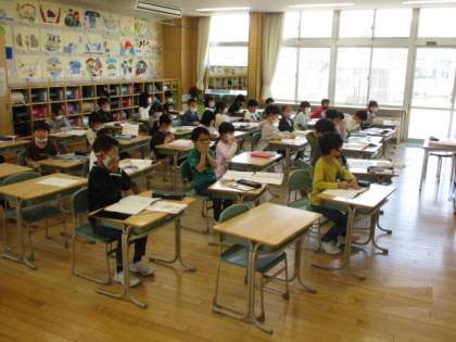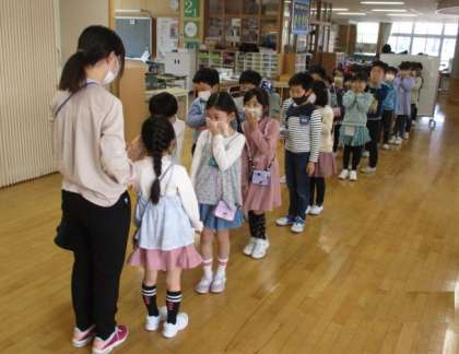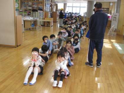 最初の避難訓練を行いました。近くの民家出火の想定で、豊田っ子たちは、緊急放送を真剣に聴き、教室横のワ−クスペ−スに整列しました。