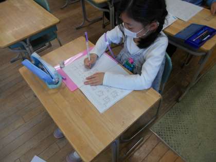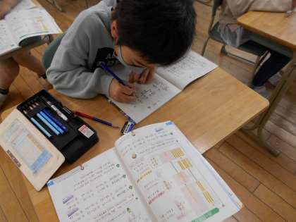 算数では、新しく筆算の仕方を学習しています。どんどん問題に取り組み、だんだんと速く解けるようになってきました。子供たちは、1年生のときよりもレベルアップした学習内容に一生懸命チャレンジしています。