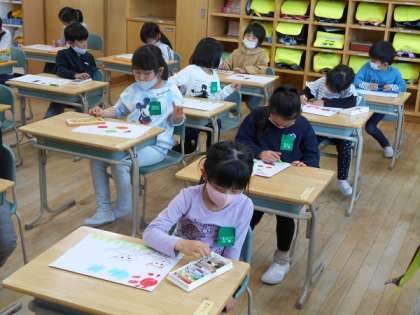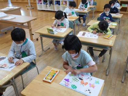 自分の好きな物を絵に表しました。動物や果物、花や乗り物等、好きな物を友達と話しながら楽しそうに描いていました。