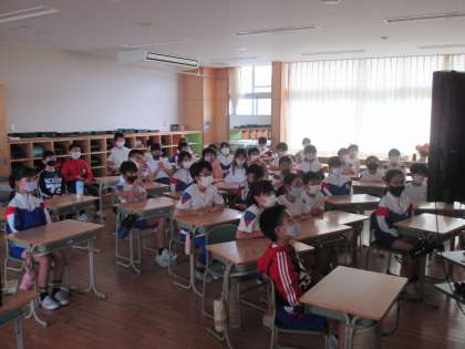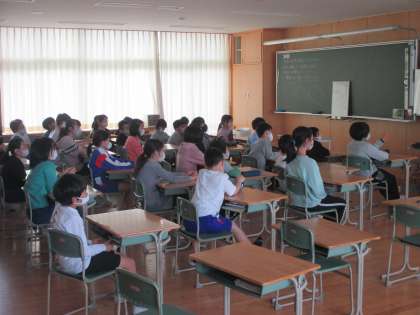 豊田っ子タイムには、児童会発足の様子が各教室に放映されました。高学年の一員として各委員会発表を真剣に聞いていました。