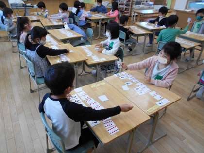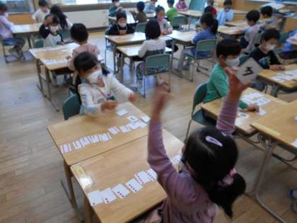 数図カードや数カードを使って、大きさ比べゲームをしました。大きい方が勝ちや、小さい方が勝ち等のルールを決めて、楽しみながら数の大小を学習しました。
