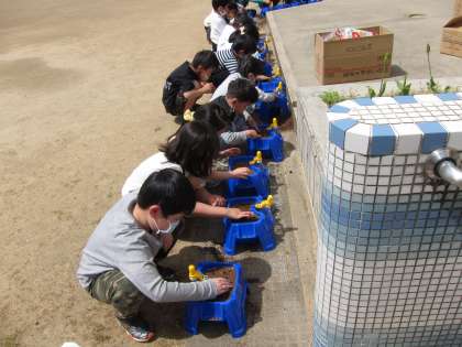 生活科「わたしのあさがお」の学習で、アサガオの種まきをしました。