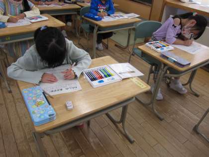 種まきをしたあと、アサガオ日記を書きました。「きれいな色のアサガオになればいいな。」「たくさんアサガオが咲けばいいな。」など、どんなアサガオになってほしいか、自分の思いを書いていました。