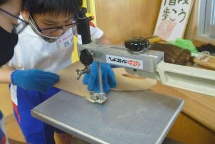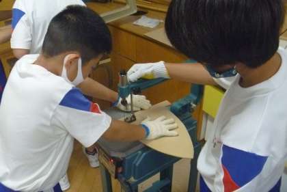 図工では糸ノコを使って木を切り、作品を作っています。慣れない糸ノコに苦戦しながらも協力することができました。
