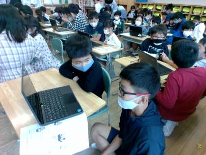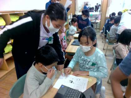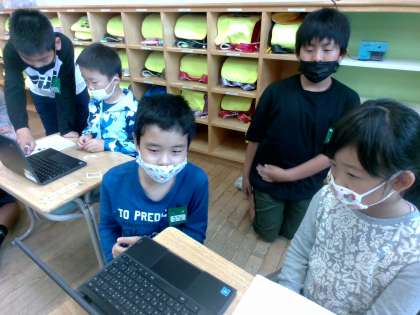 1年生にクロームブックの使い方を教えました。目線を合わせ、やさしく丁寧に教える姿が見られました。