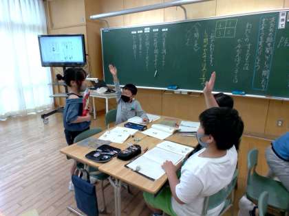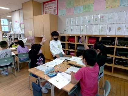 国語科の学習では、友達の話を聞いてもっと知りたいと思ったことを考えて質問しました。子供たちは、友達の好きなものや今頑張っていること、最近の出来事など詳しく知ることができました。
