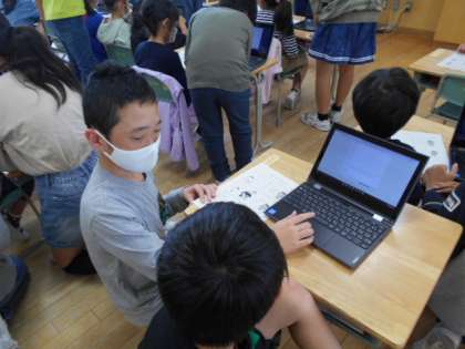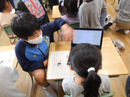 クロームブックの活用の仕方を1年生に教えている様子です。優しく丁寧に教える6年生の姿が見られました。