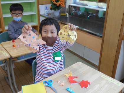 子供たちから「星みたいな飾りができました。」「ダイヤモンドの形ができました。」などの声があり、きれいな飾りや面白い形の飾りができたようです。