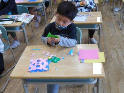 図画工作科「ちょきちょきかざり」の学習で、折り紙をはさみで切って飾りを作っています。