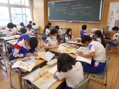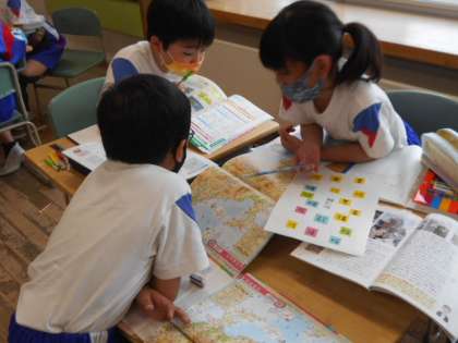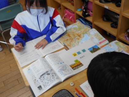 1組では、各市町村の産業や特産品について調べました。土地利用を関連付けて考える児童もたくさんいました。