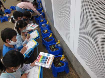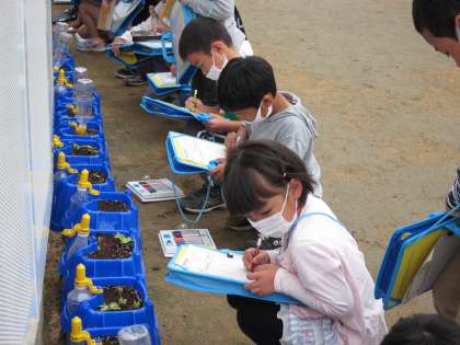 アサガオの芽が出てきました。アサガオの芽を観察した子供たちは、「芽が出てうれしいです。」「芽が2つ出ていました。もっと出てほしいです。」などと、話していました。