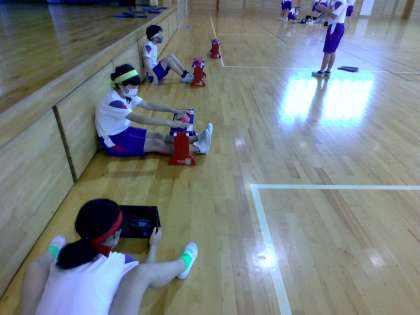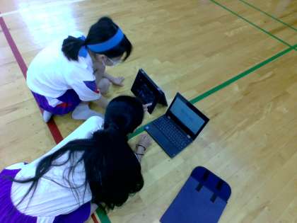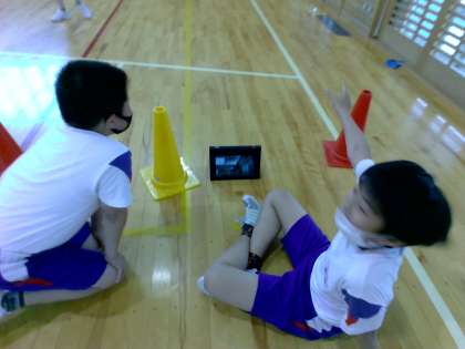 ランランオリンピックが延期となりましたが、アリーナの中で体を動かしました。反復横跳びや上体起こしなどの基本的な動作を確かめました。撮影した動画を見直し、動きの確認をしている子供の姿が見られました。
