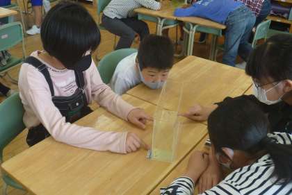 理科では、メダカのオスとメスの判別の仕方を学習しました。実際に動くメダカを見ながら、腹のふくらみ、しりびれと背びれの形に注目して、一生懸命観察していました。