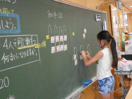 算数科では、割り算の仕方の学習が始まりました。大きい数でも、10や100のまとまりを意識して割ることができることを学びました。