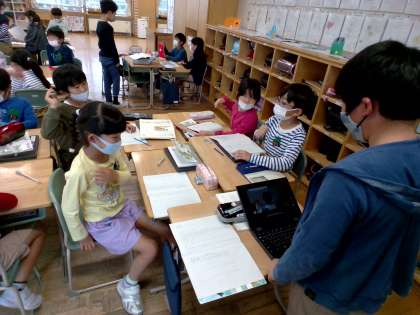 パソコンを使って自分が話したり、質問に答えたりする様子を撮影しました。動画を見た子どもたちは、「友達のことがよく分かりました」「もっと大きな声を出せばよかったです。」等と振り返っていました。
