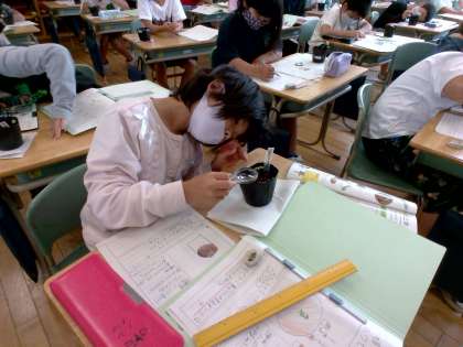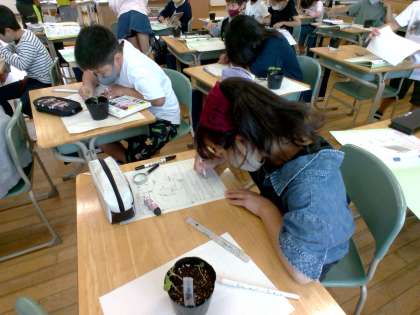 理科の学習では、ホウセンカの観察をしました。先週観察したときには、芽が出たばかりでしたが、ずいぶんと大きくなりました。子供たちは前に観察した時の様子と比べて、「○cm大きくなった!」「葉の数がふえた!」などと、いろいろなことに気付いていました。
