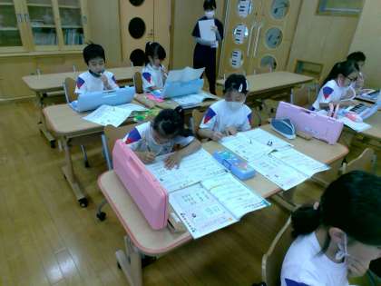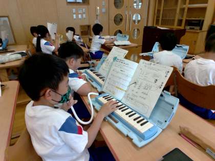「海風をきって」の曲の最後の部分の旋律づくりをしました。子供たちは、「イルカが静かに泳いでいる感じにしたい」「イルカが大きくジャンブした様子を音で表したい」などと自分なりの思いをもって、鍵盤ハーモニカで音を確かめながら取り組みました。