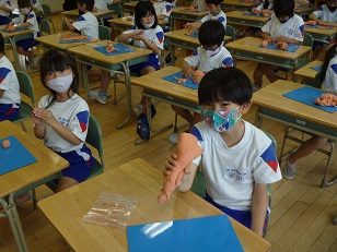 粘土を伸ばしたり丸めたり、ちぎったりくっつけたりしながら、いろいろな形を表現することができました。