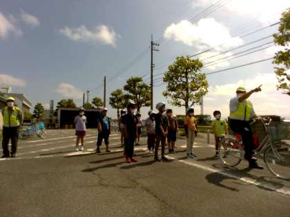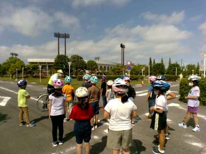 学級ごとに自転車教室へ行ってきました。実技練習前に、自転車の乗り方について教えてもらいました。とても真剣に聞いています。